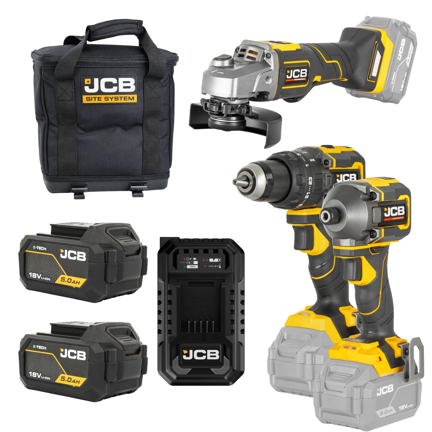 Zestaw elektronarzędzi JCB Professional 18V (JCB-18PKIT-7) to kompletne rozwiązanie dla profesjonalistów wymagających uniwersalnych narzędzi do pracy na budowie, w warsztacie i serwisie. Zawiera wiertarko-wkrętarkę udarową 75Nm z uchwytem ROHM 13mm, zakrętarkę udarową 230Nm z uchwytem 1/4" HEX oraz szlifierkę kątową 125mm z hamulcem elektrycznym. Zestaw narzędzi akumulatorowych uzupełniają dwa akumulatory E-TECH 5,0Ah, ładowarka 4,5A i torba narzędziowa kompatybilna z systemem JCB Site System.